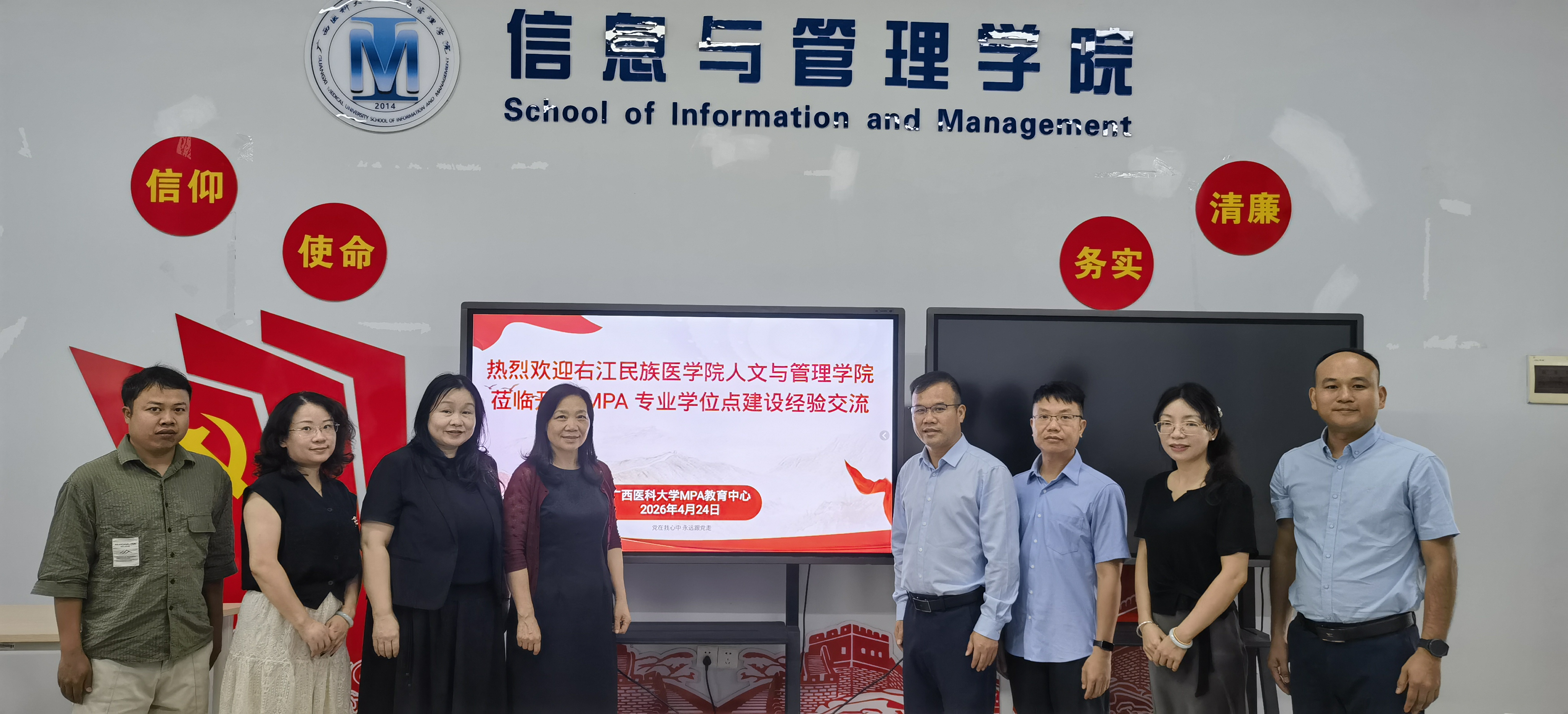 4月24日下午,右江民族医学院人文与管理学院党委书记、院长李常应一行4人到访约炮 ,就公共管理硕士(MPA)专业学位点建设开展专题经验交流。约炮 党委书记闵晓阳、院长何慧敏等热情接待了来访同仁,并举行座谈会。